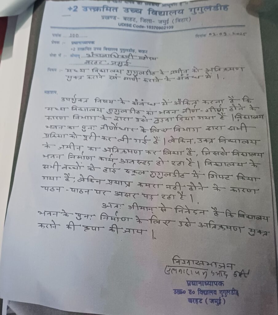 जमुई जिले के बरहट प्रखंड के गुगुलडीह गांव में मध्य विद्यालय की जमीन पर कथित अवैध कब्जे का मामला सामने आया है। ग्रामीणों ने जिलाधिकारी को आवेदन देकर आरोप लगाया है कि गांव के ही कुछ लोगों—निरंजन कुमार सिंह, विनय कुमार सिंह और नीरज कुमार सिंह—ने पुराने विद्यालय भवन को टूटने के बाद जमीन पर अवैध कब्जा कर लिया है।
